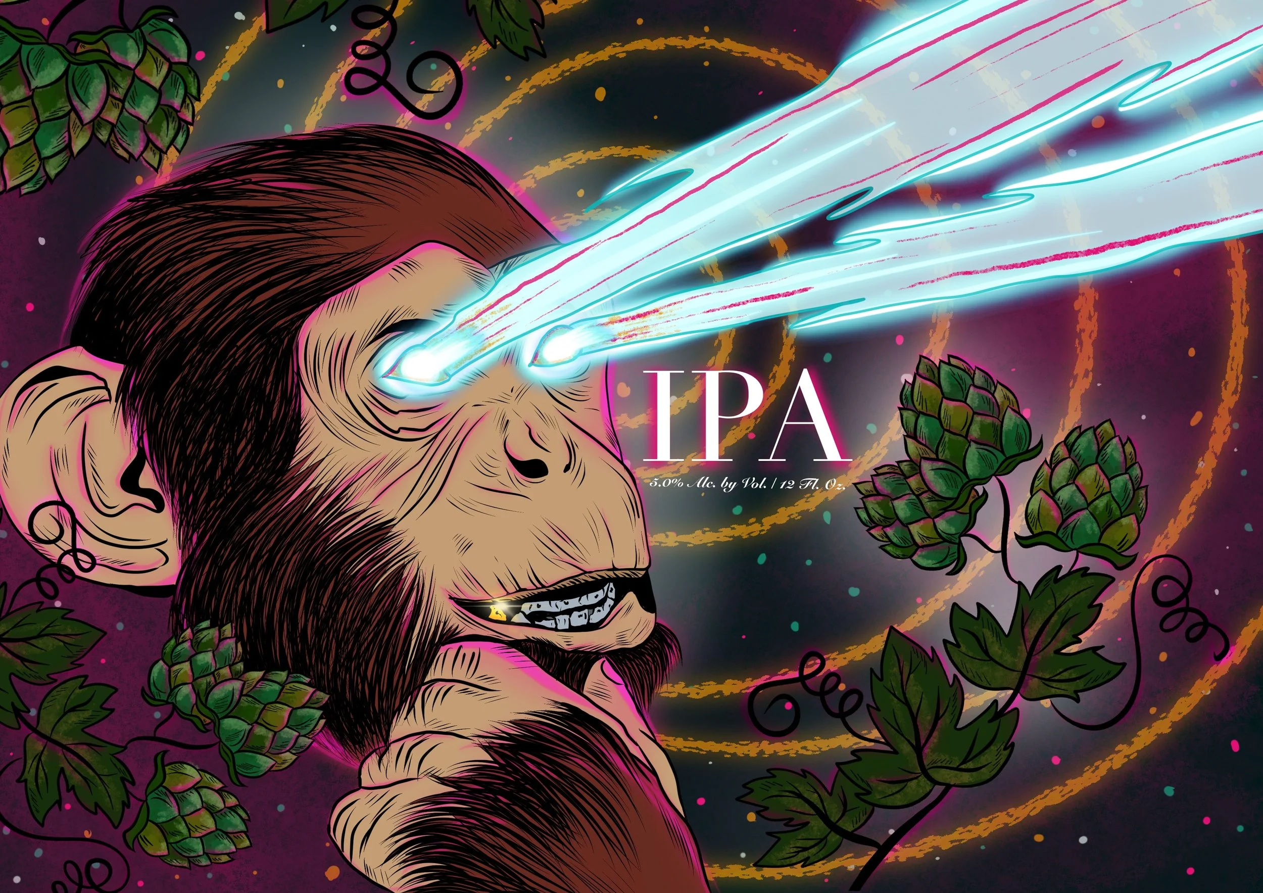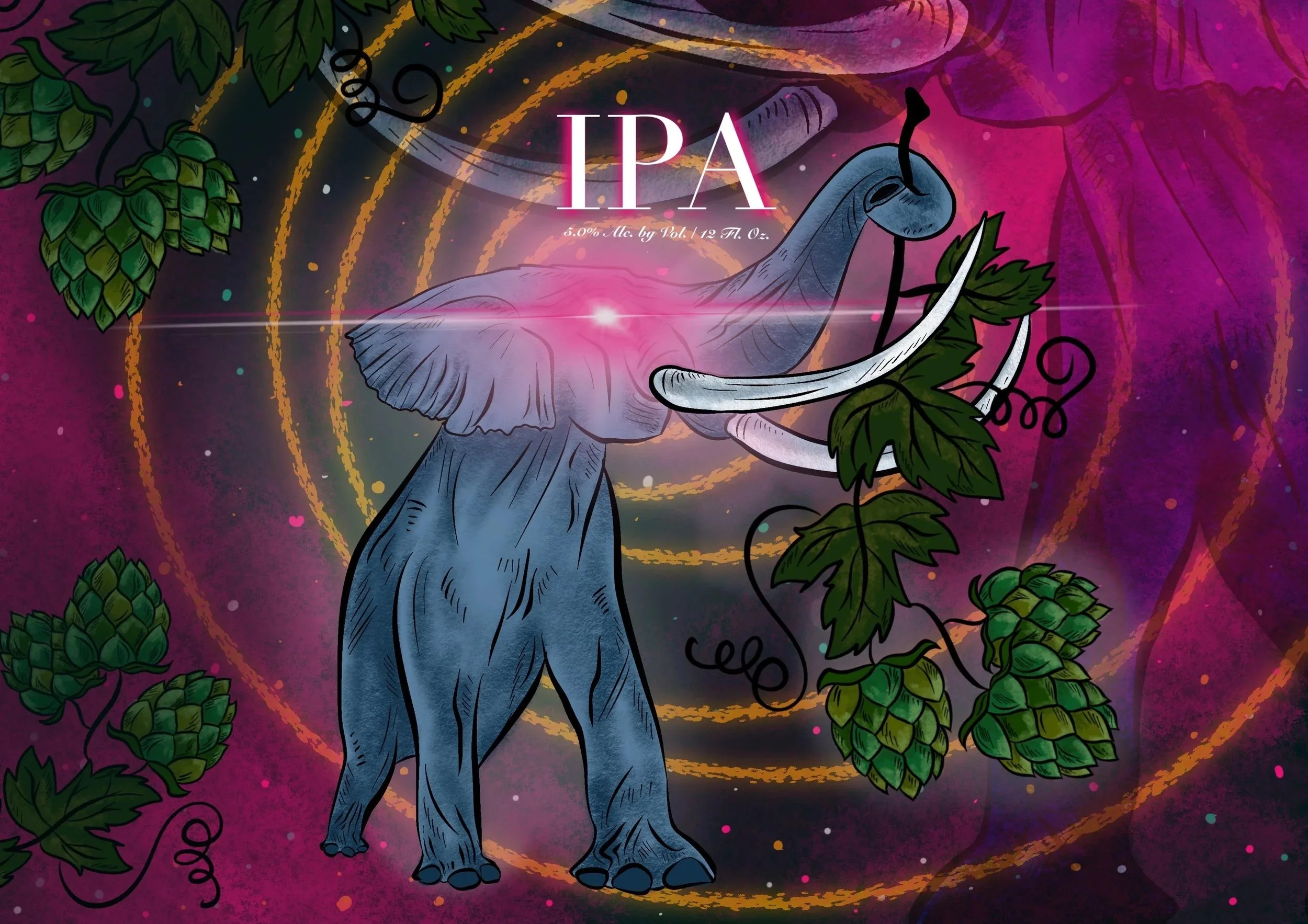 This IPA design tells a story through bold, imaginative artwork that merges animal symbolism with cosmic energy. At the heart of the label are two striking figures—the monkey and the elephant—each chosen not only for their visual impact but also for the traits they represent. The monkey, mischievous and lively, reflects the adventurous, hop-forward bite of the IPA. Its glowing, electric eyes suggest intensity, curiosity, and a burst of energy—just like the first sip of a crisp, aromatic IPA. In contrast, the elephant embodies strength, balance, and groundedness, qualities that echo the malt backbone which steadies the beer’s flavor.